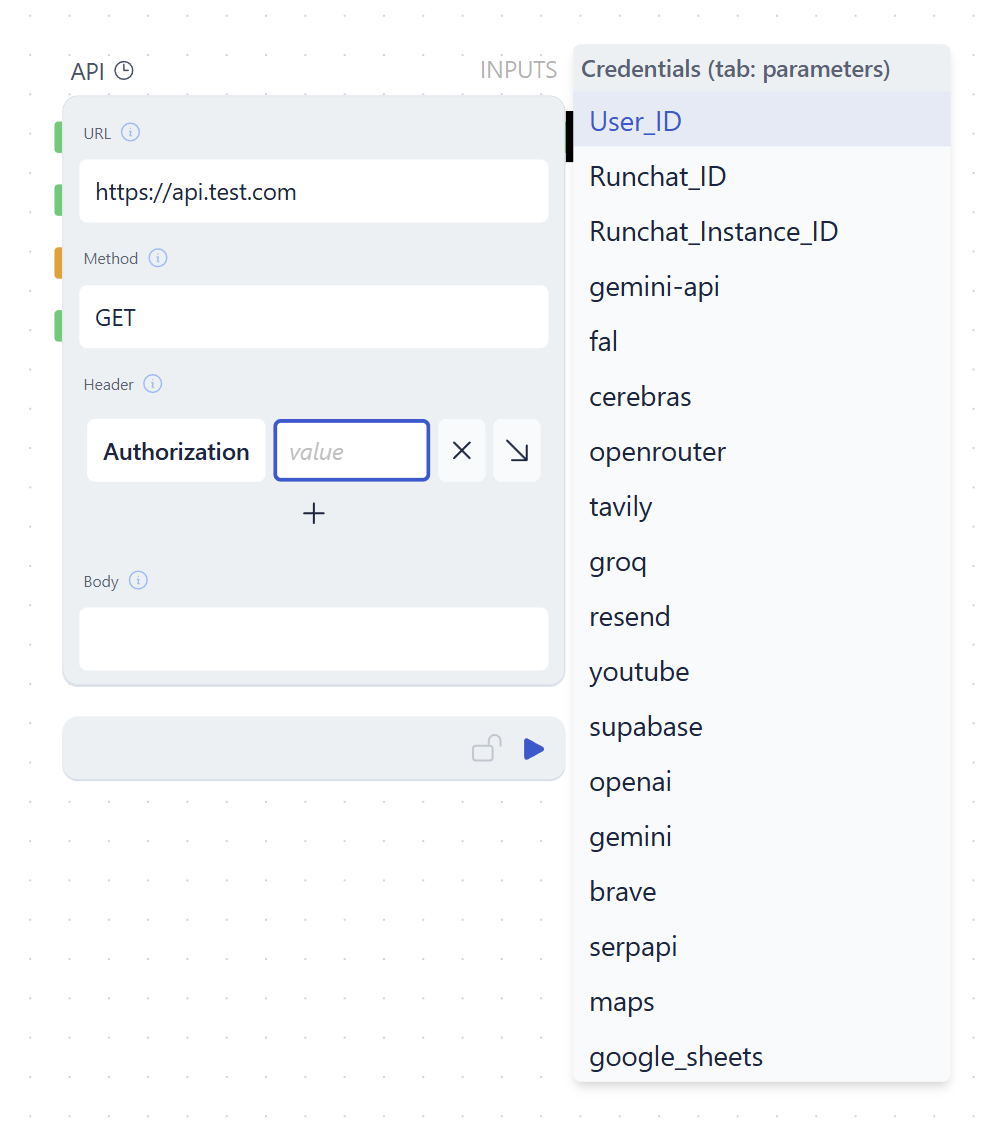 This will display a list of all keys and services you have added as well as some global variables like the ids of the current runchat, runchat instance and user.