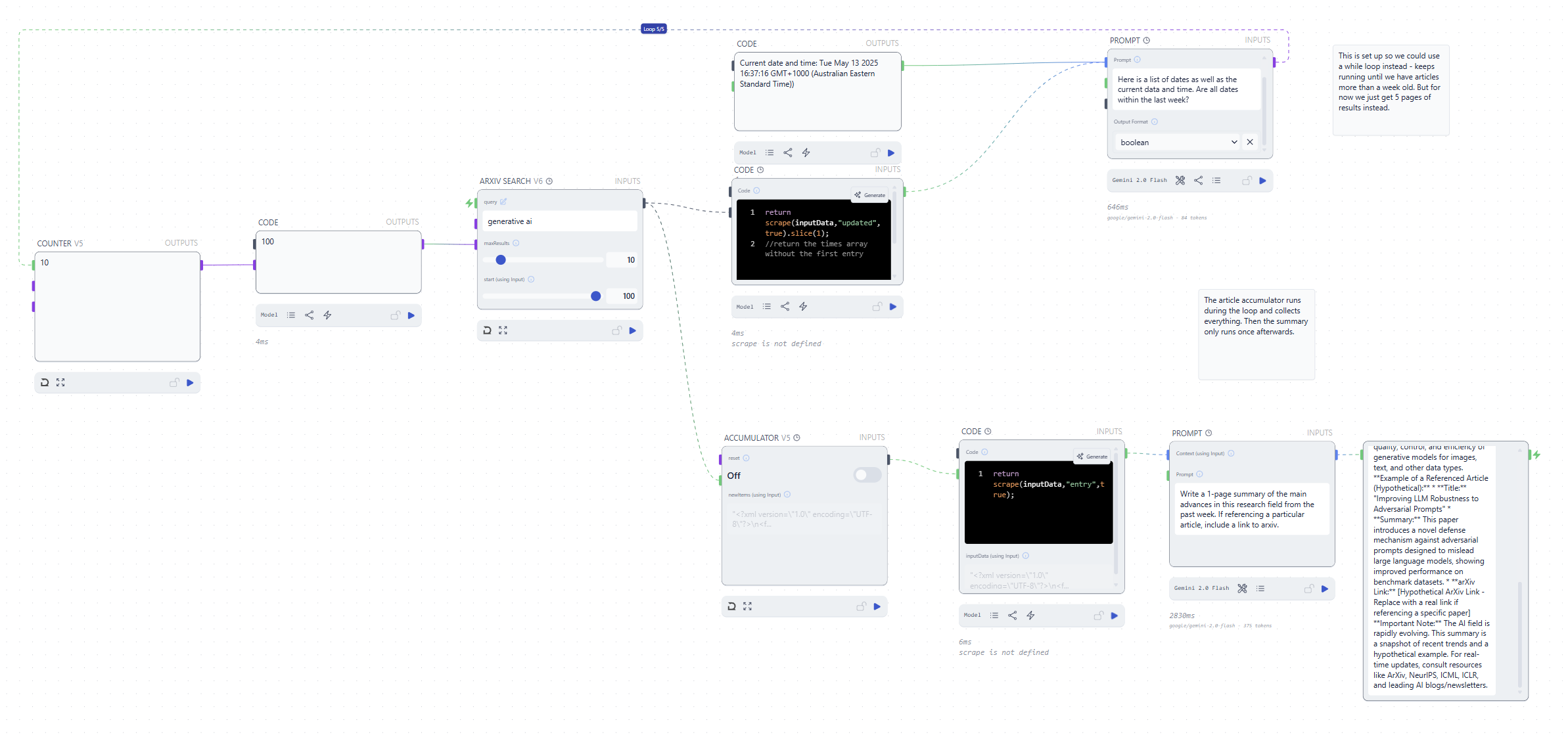providing more specific guidance on concepts the user is interested in, fetching and summarizing the full article HTML or PDF content, or running this workflow on a schedule to collect research over time.
