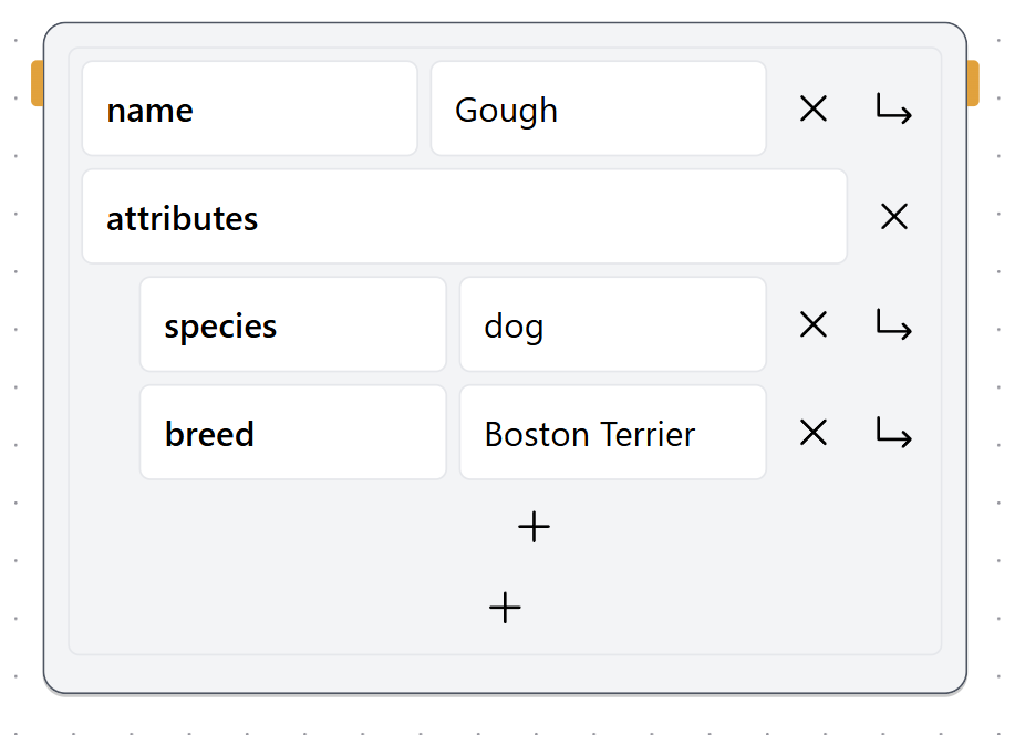 The object node allows you to define collections of properties using key-value pairs. Values can be plain text or nested objects. To create a nested object, click the down-right arrow. To add a key-value pair to the object or nested object, click the + button beneath the object you want to add. To remove a key-value pair, click the x.